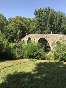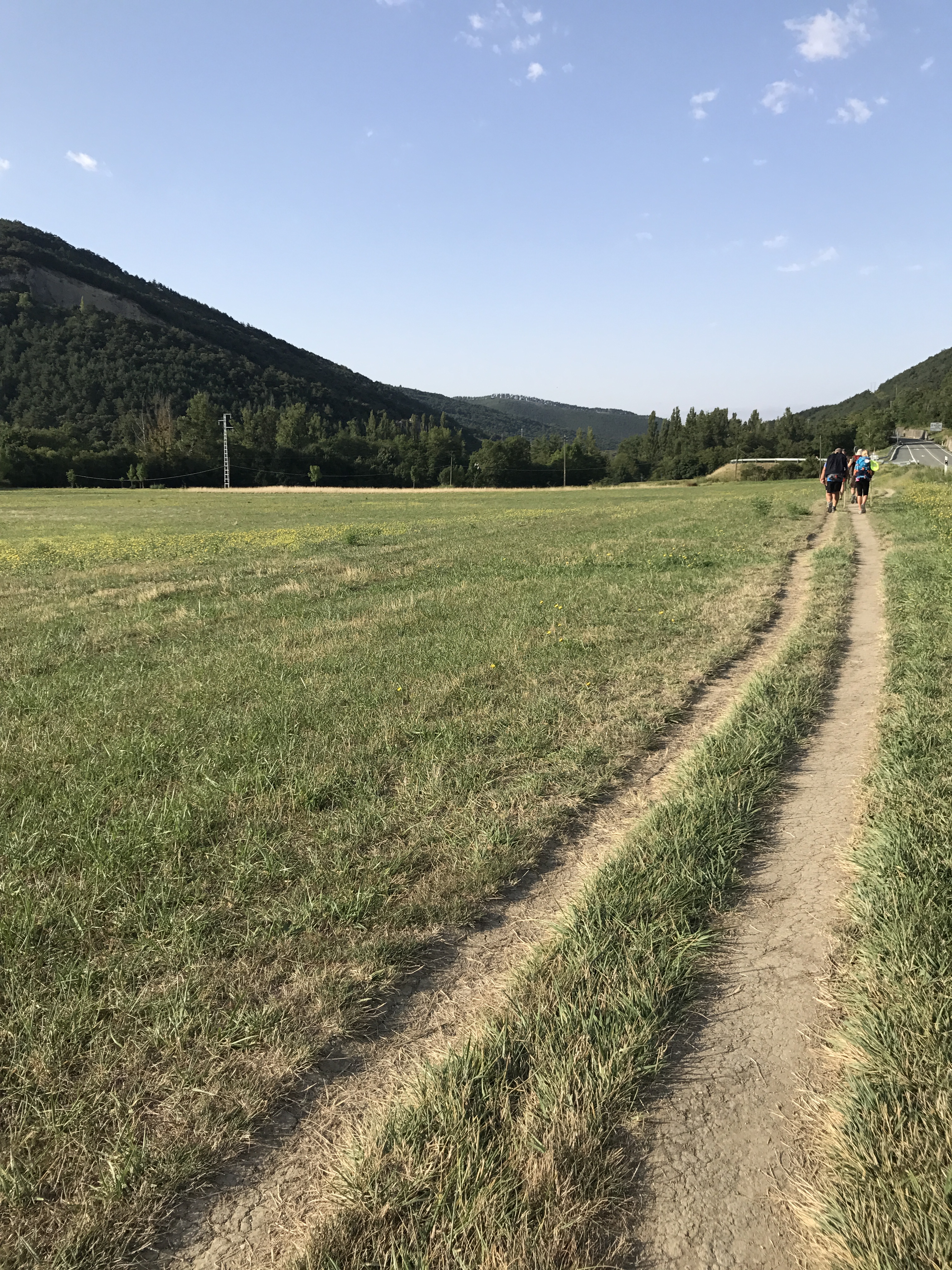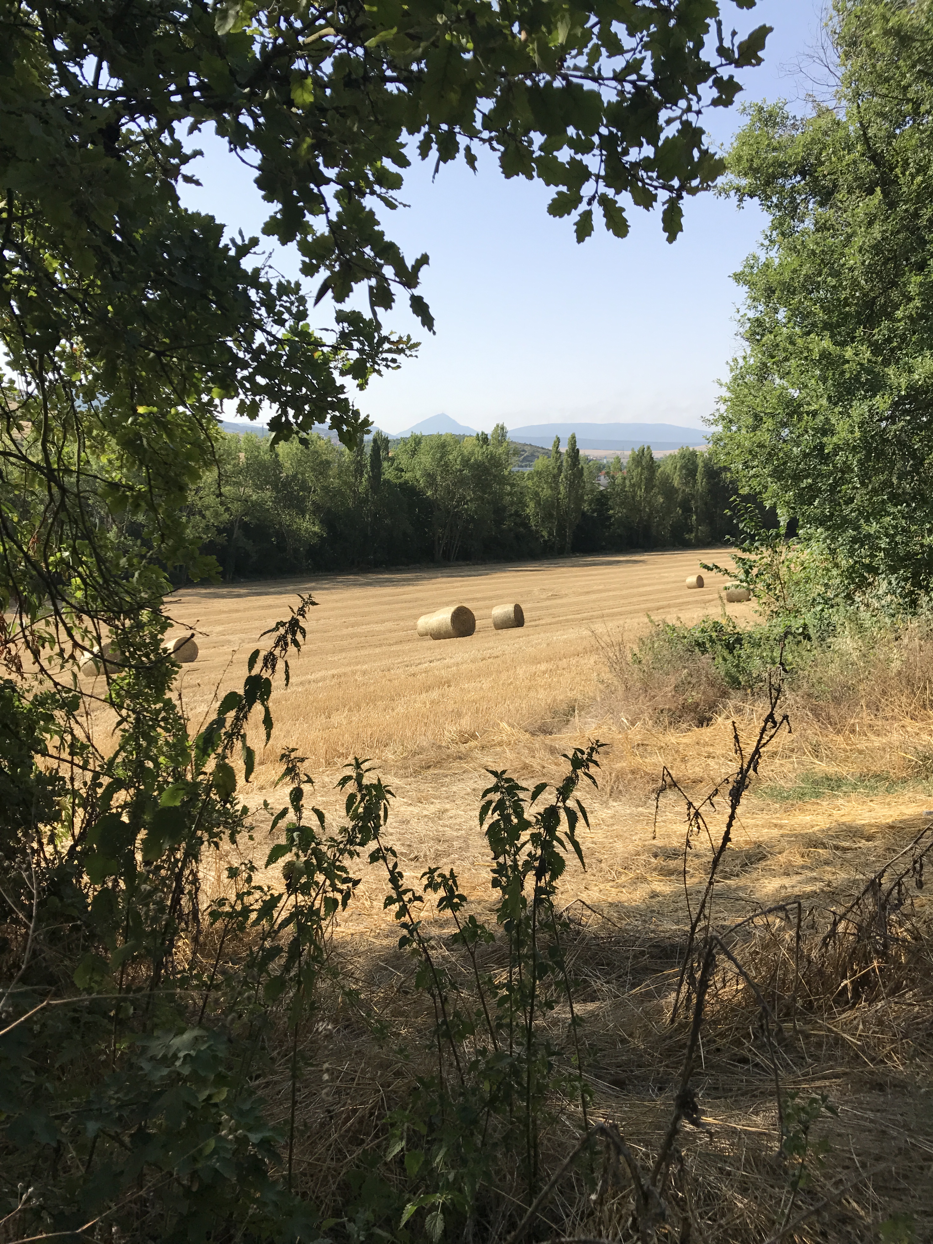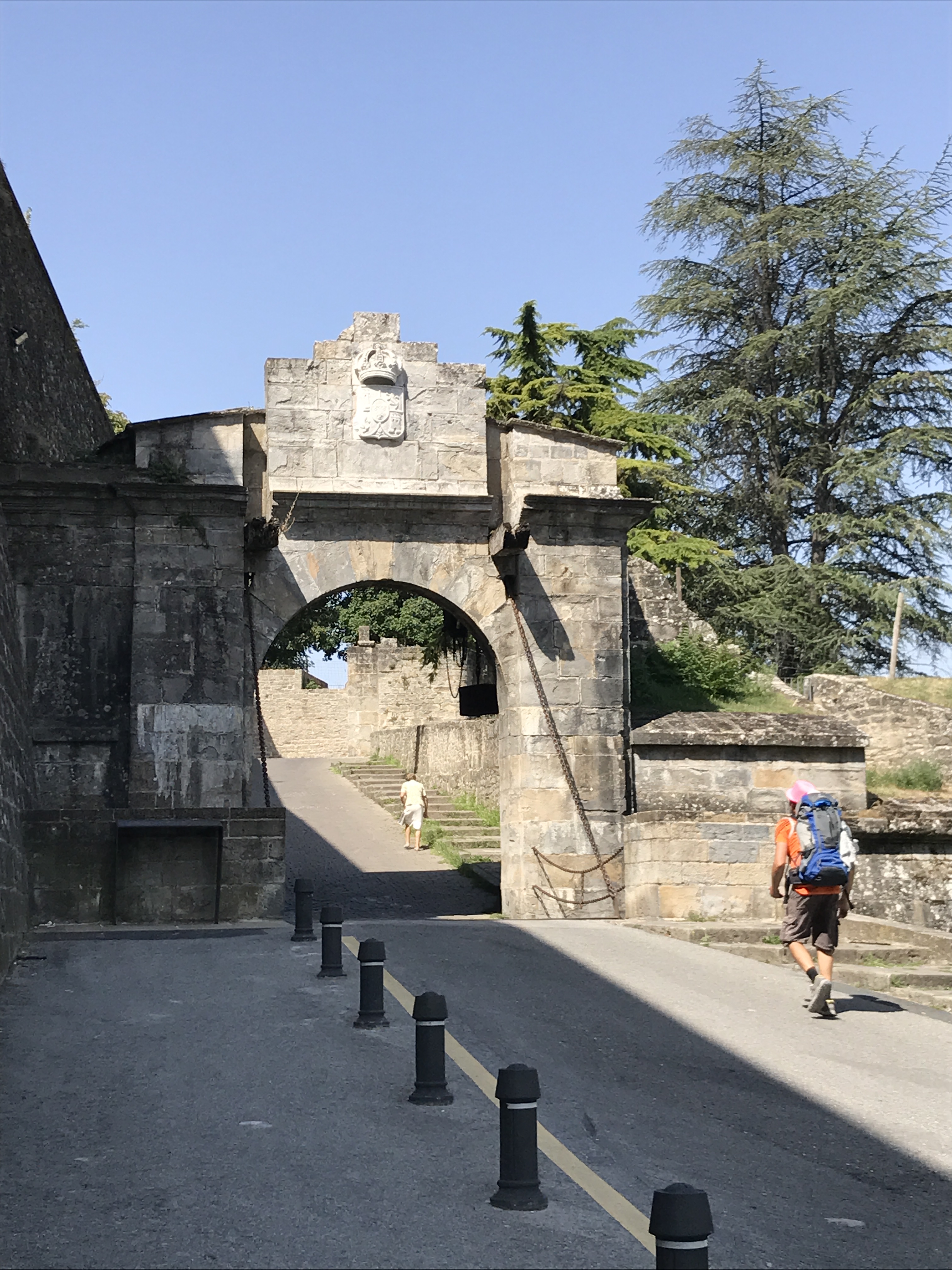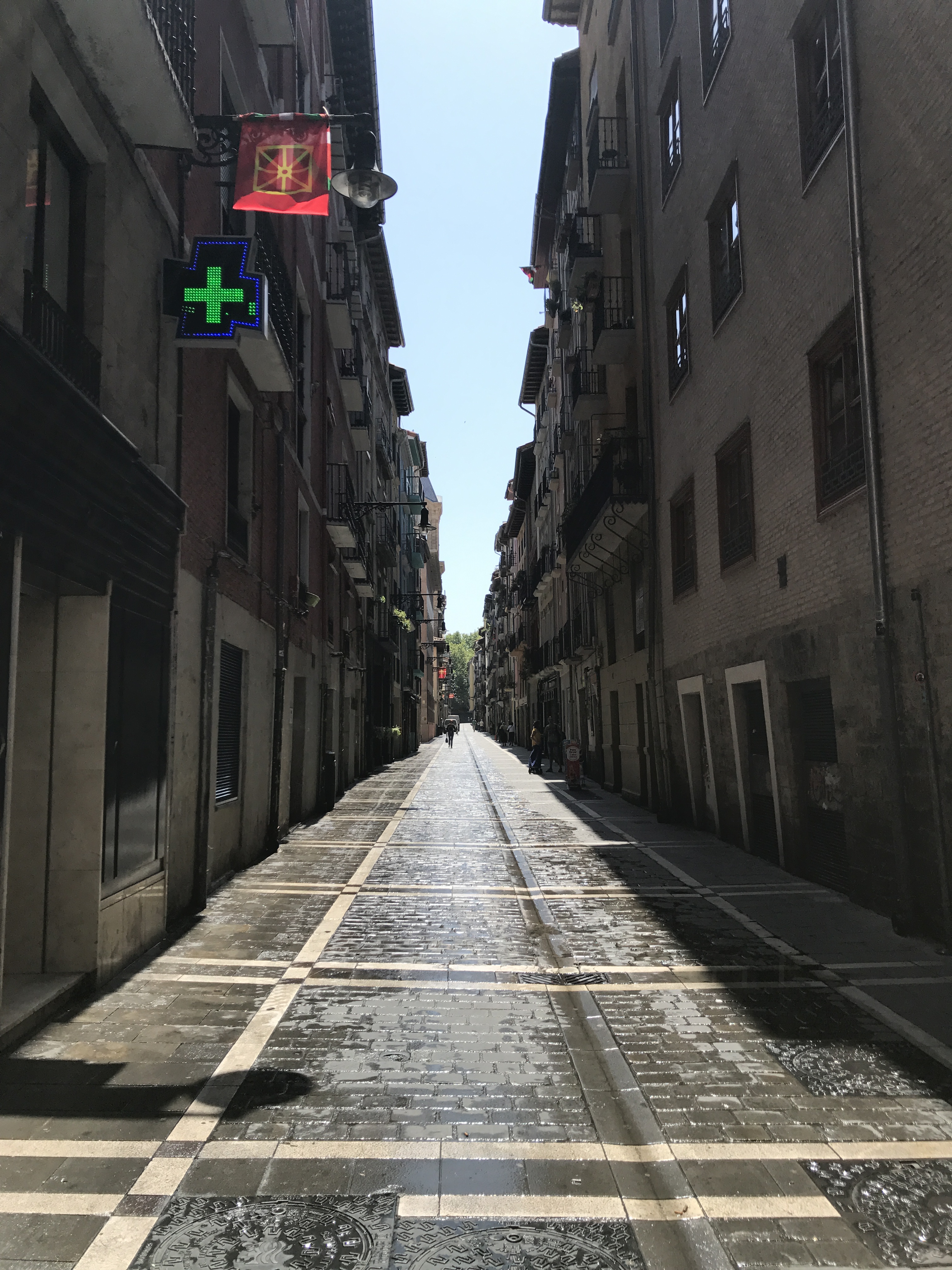 Nun haben wir genug Zeit, unsere Gedanken schweifen zu lassen und sich auf unsere Werte zu besinnen. Pilgern kann sehr schön sein, wenn man an sich selbst arbeitet, wenn man an sich selbst zweifelt. Ein schöner Nachmittag in Pamplona gestaltet sich nicht von selbst allein. Wir müssen uns ausruhen, wir sollten mehr lesen, damit wir endlich ein Buch auf dem Weg liegen lassen können. Die acht mitgebrachten Bücher sind selbstverständlich eine große Bereicherung für uns, aber nun auch eine große Last. Morgen warten auf uns 42 km. Unser Ziel ist ein hoffentlich wunderschönes Hotelzimmer: La casa mágica, das magische Haus, heißt unsere Herberge, das vegetarische Speisen anbietet. Schön ist der Weg nach Santiago! Schön ist es, das Leben außerhalb der rosa Plastikwelt leben zu dürfen.