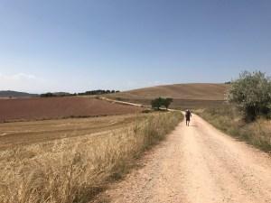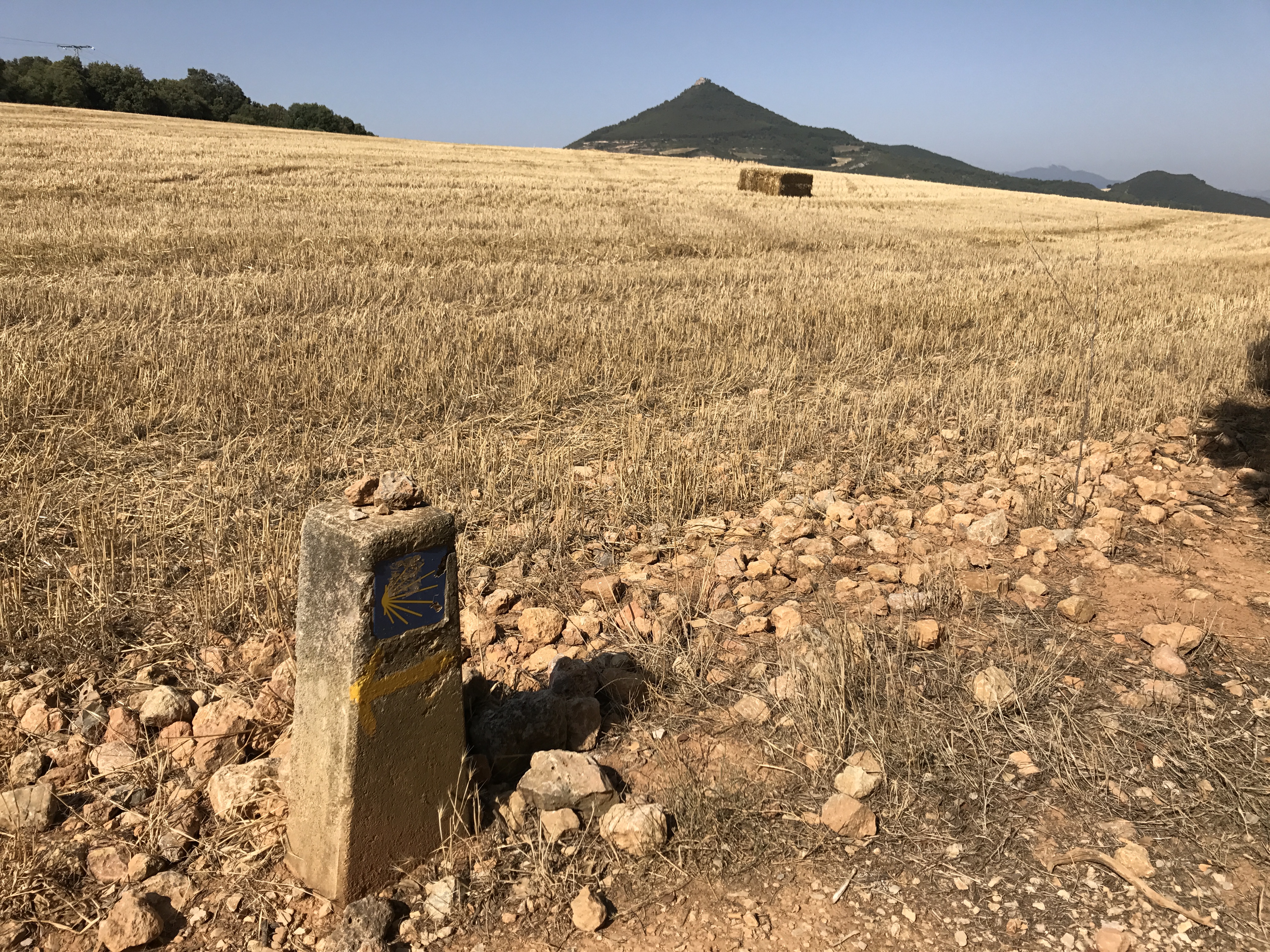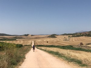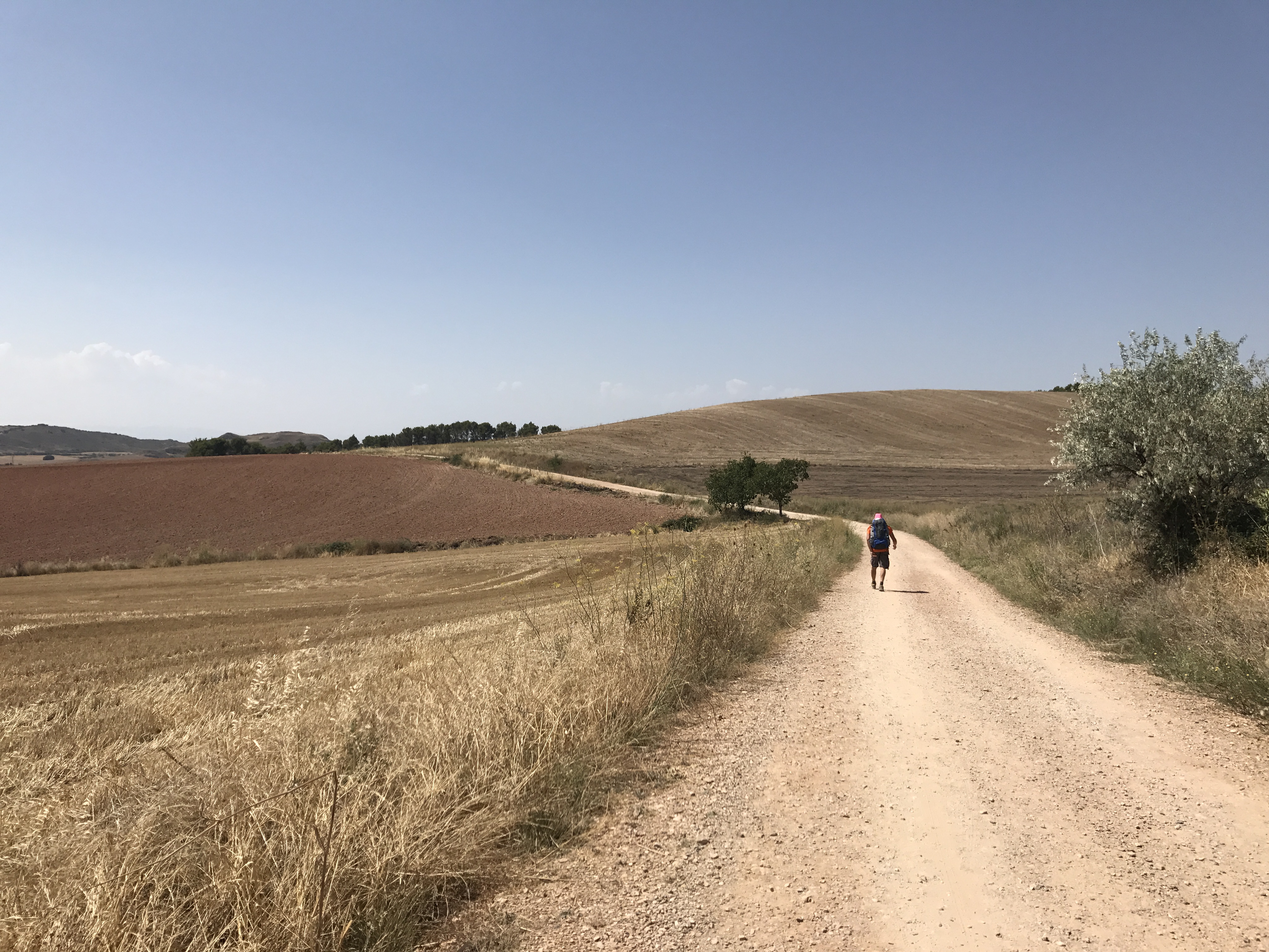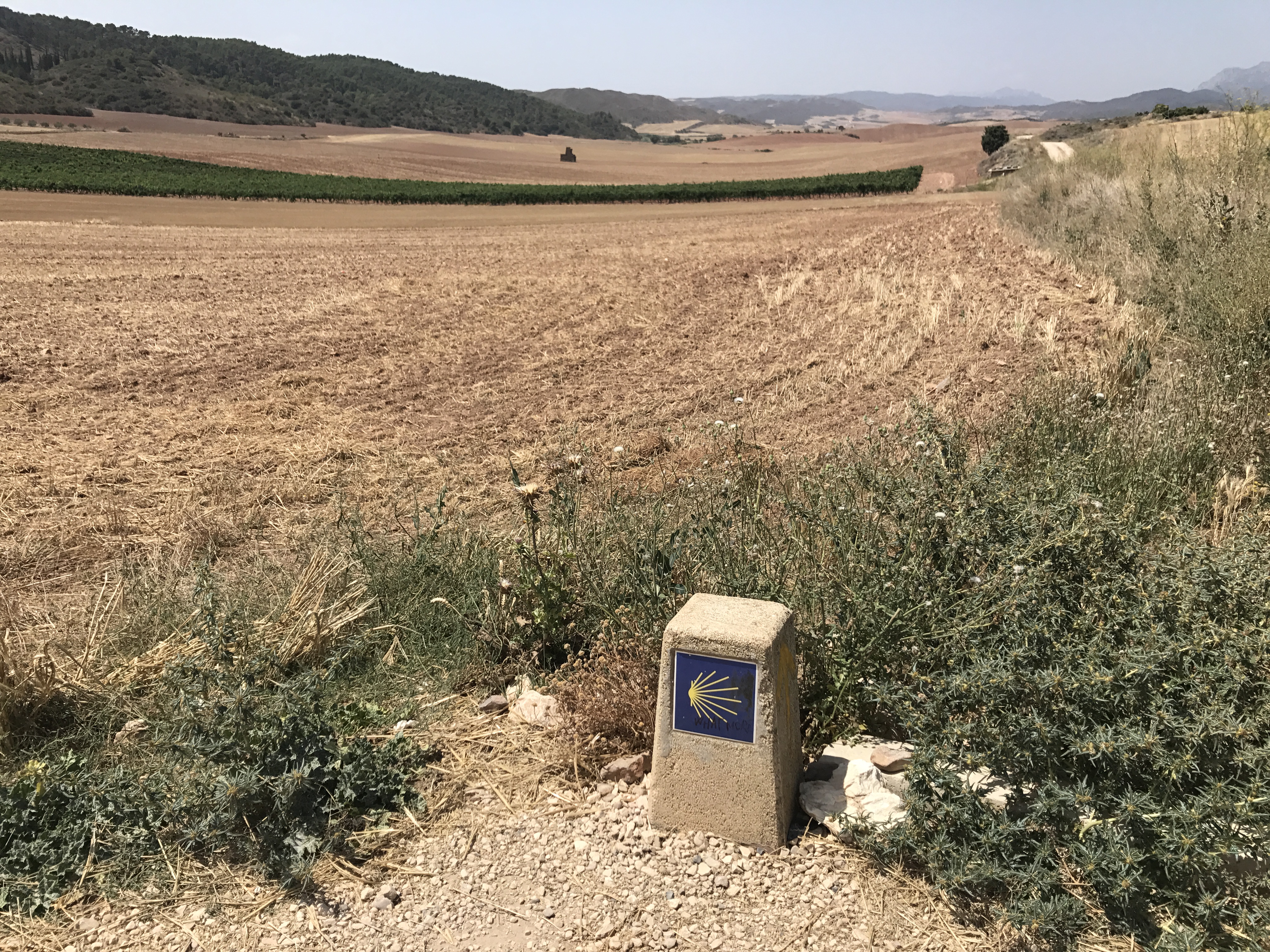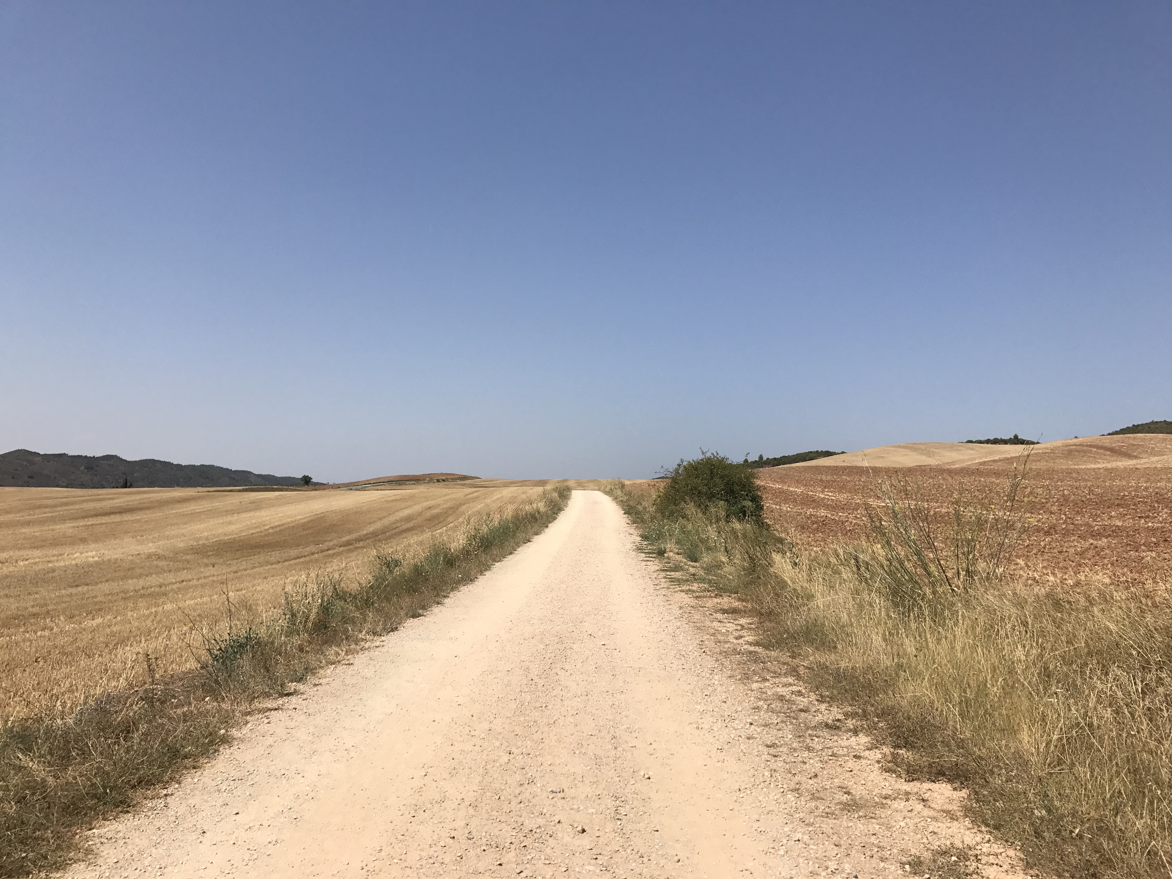 Der Weg von Villatuerta nach Los Arcos (24 km) ähnelte schon ziemlich dem, was man sich landschaftlich als Jakobsweg vorstellt: endlose abgeerntete Weizenfelder, Olivenhaine, Weinberge, blauer wolkenloser Himmel und eine um die Mittagszeit gnadenlos scheinende Sonne. In dieser Landschaft – auf den schnurgeraden Wegen – muss man kaum aufpassen, wo man tritt; deshalb hat man viel Zeit zum Nachdenken. Ich dachte an die vielen Freunde, die diesen Weg gerne gehen würden, aber immer wieder den Gedanken an diesen Weg vertagen. Ich dachte an zwei meine Freundinnen, die so gern dieses Abenteuer erleben würden, werden jedoch von ihren Ehemännern stets ausgebremst.