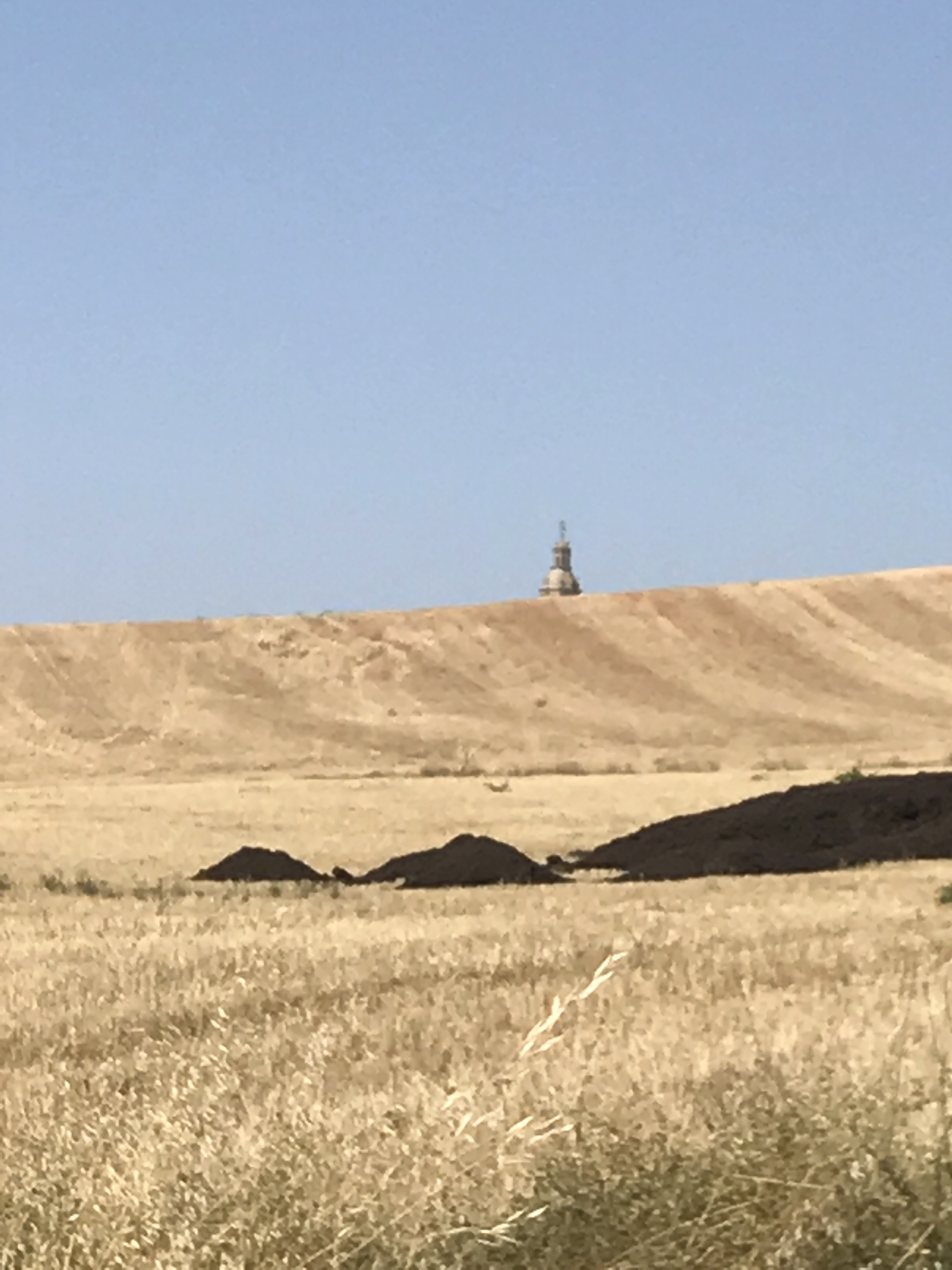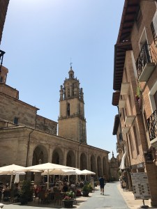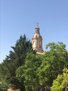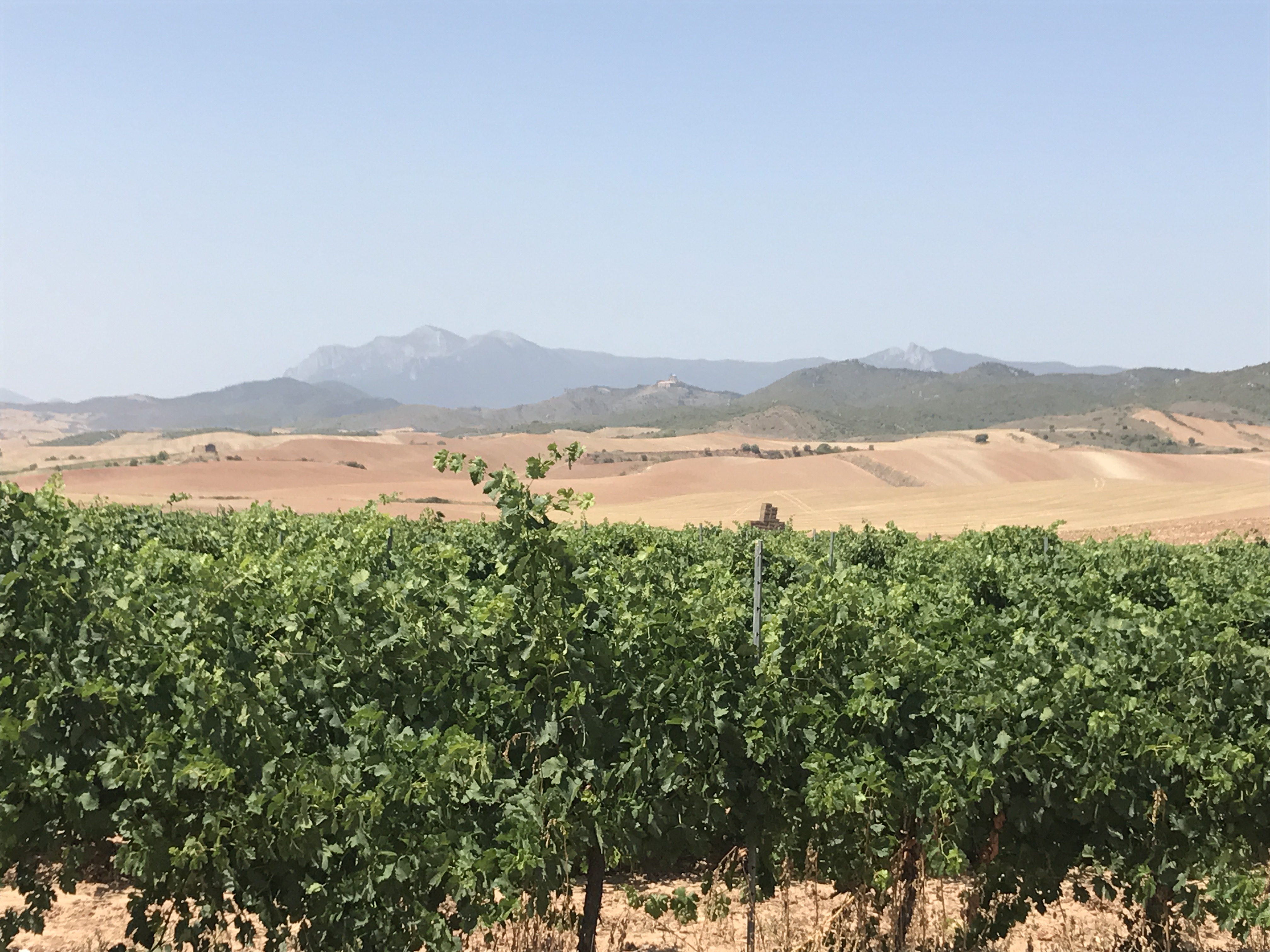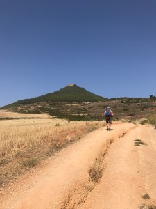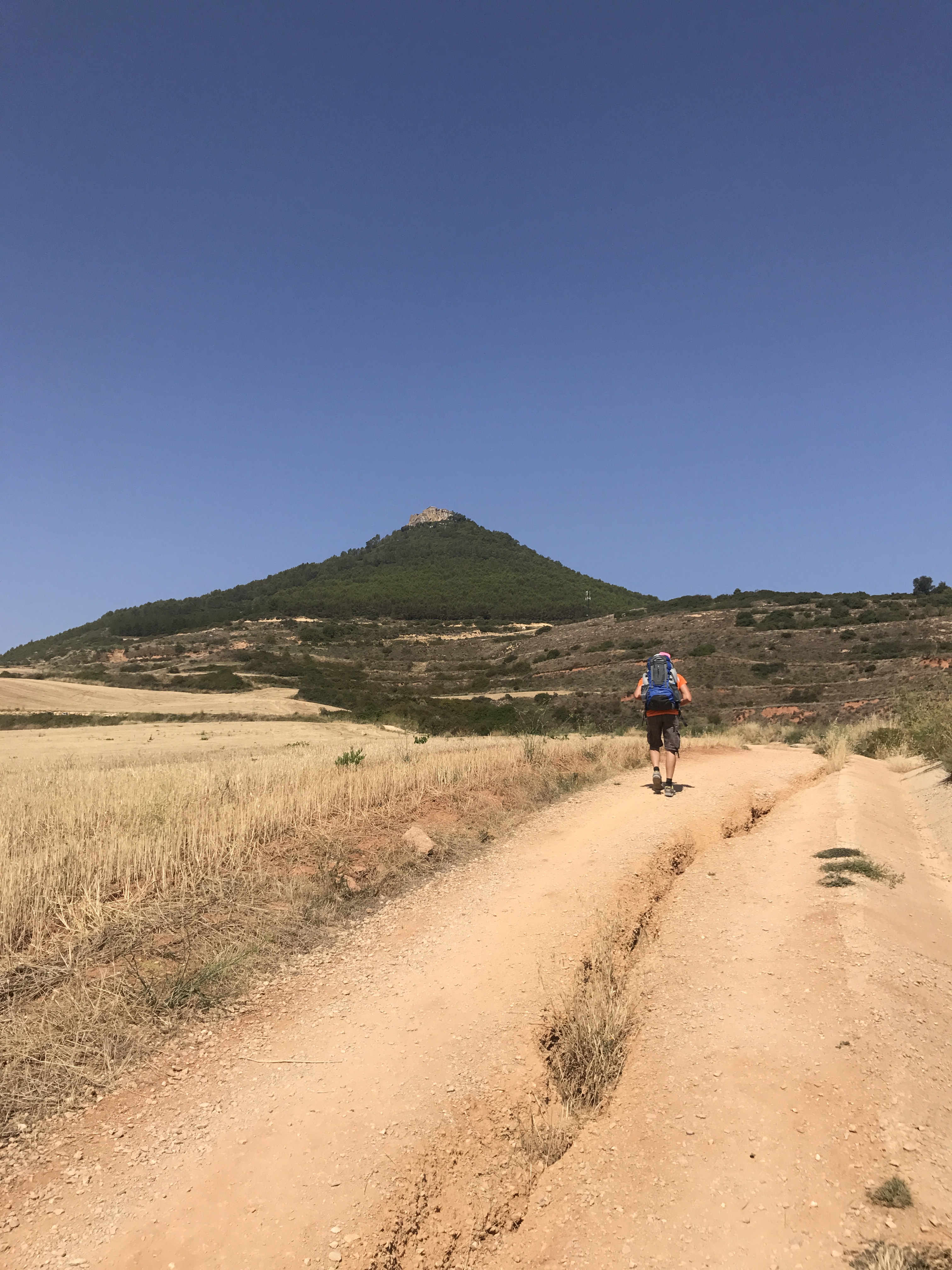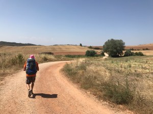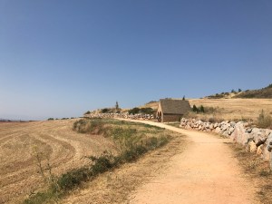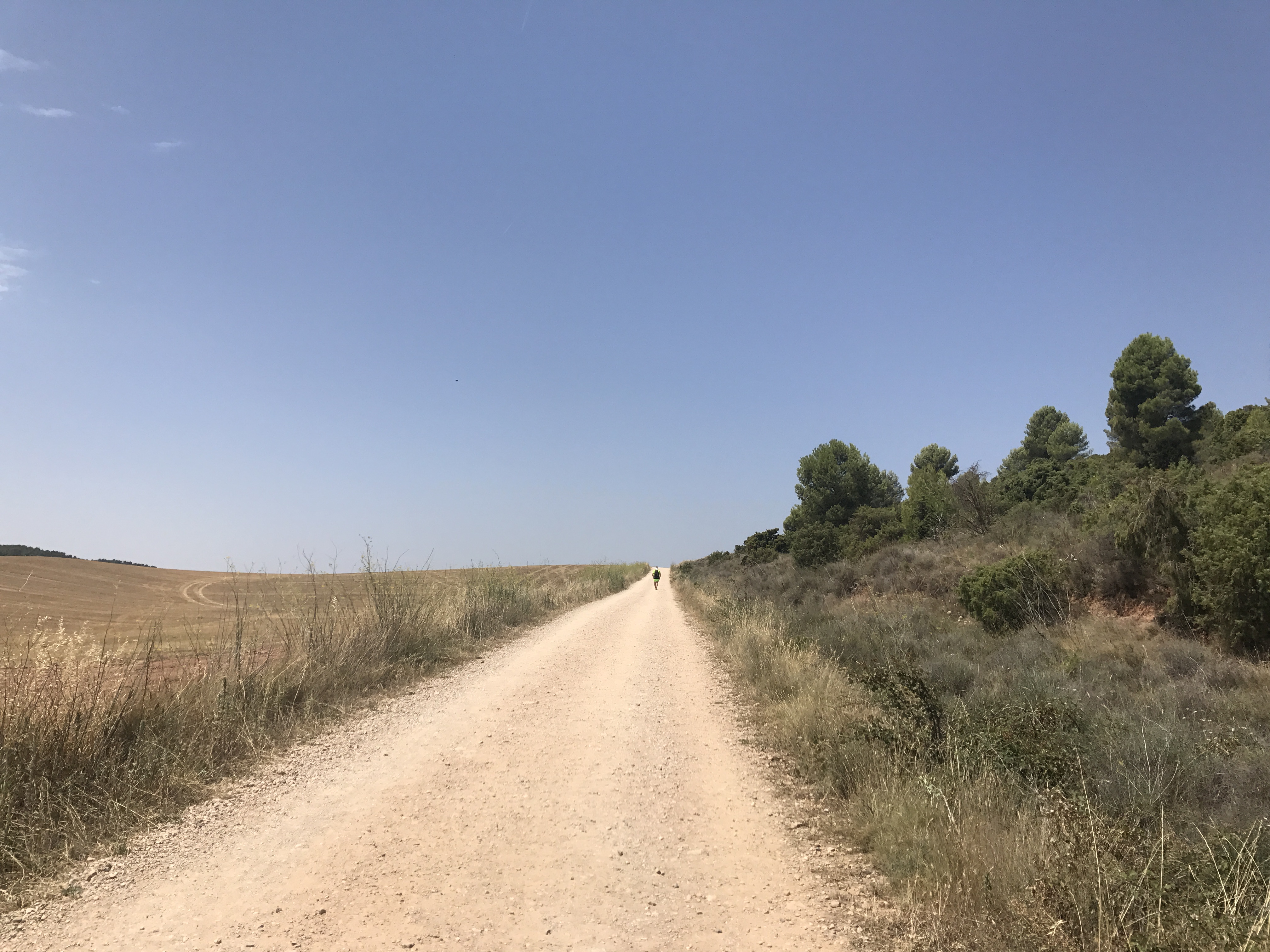 Der Weg von Villatuerta nach Los Arcos (24 km) ähnelte schon ziemlich dem, was man sich landschaftlich als Jakobsweg vorstellt: endlose abgeerntete Weizenfelder, Olivenhaine, Weinberge, blauer wolkenloser Himmel und eine um die Mittagszeit gnadenlos scheinende Sonne. In dieser Landschaft – auf den schnurgeraden Wegen – muss man kaum aufpassen, wo man tritt; deshalb hat man viel Zeit zum Nachdenken. Ich dachte an die vielen Freunde, die diesen Weg gerne gehen würden, aber immer wieder den Gedanken an diesen Weg vertagen. Ich dachte an zwei meine Freundinnen, die so gern dieses Abenteuer erleben würden, werden jedoch von ihren Ehemännern stets ausgebremst.