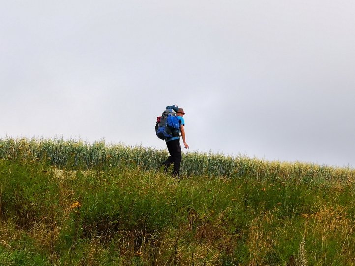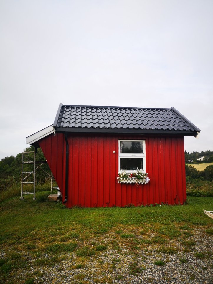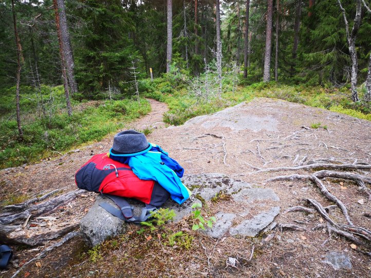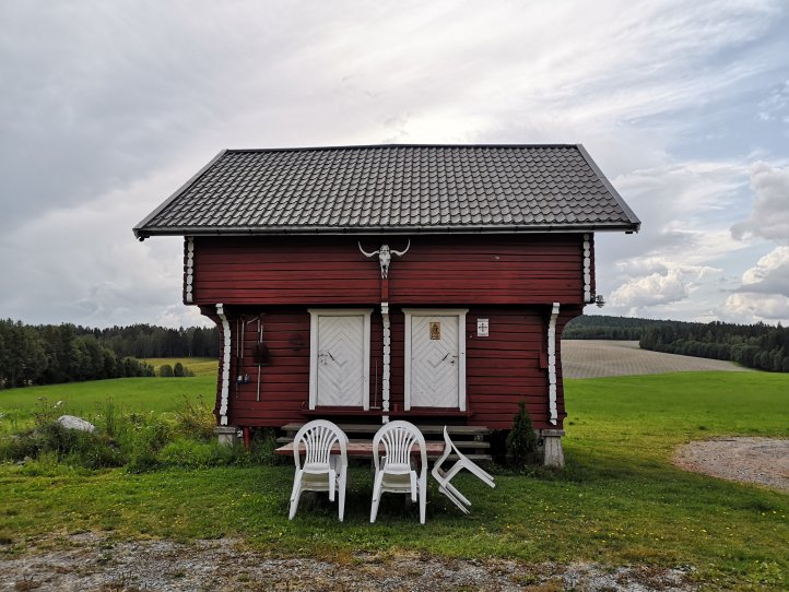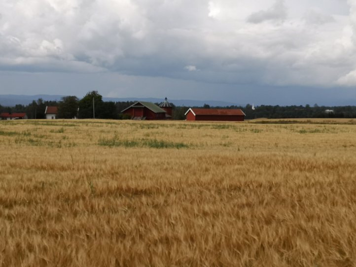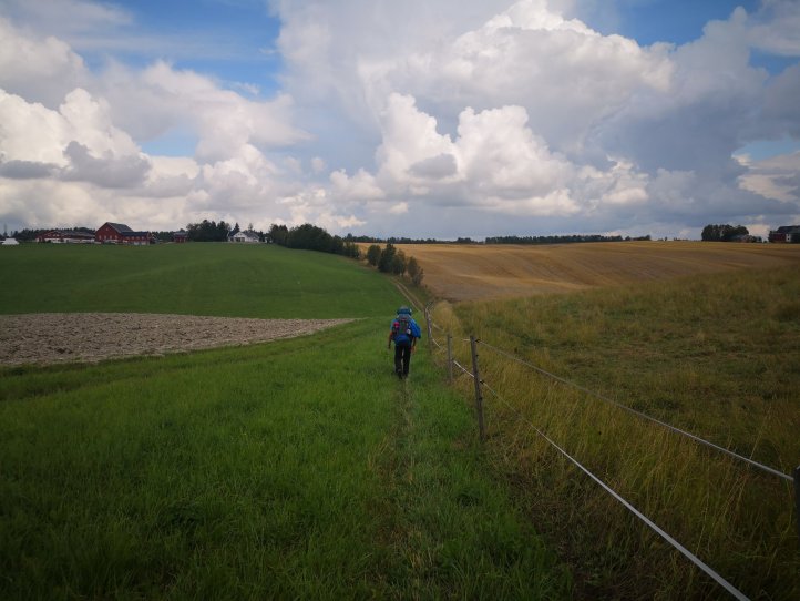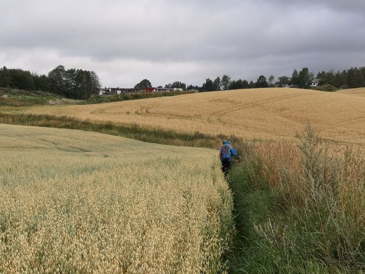 In der Nacht hat es geregnet. Wir haben aber sehr gut geschlafen und konnten 7:45 loslaufen. Den ganzen Vormittag wollten mich meine Beine nicht tragen. Ich war ziemlich verzweifelt. Wir schwitzten, weil die Sonne brannte. Wir schwitzten, weil es mal durchs Gestrüpp auf dem Feld, mal im dichten Wald ging. Die Etappe war sehr abwechslungsreich, aber mit kleinen Abstechern länger als erwartet. Das erste Café hatte noch zu als wir vorbei kamen; das nächste Café erreichten wir erst nach 12 Uhr. Es war ein Segen. Dann ging es mir fantastisch; ich strotzte vor Energie und der Weg war wunderschön. (Achtung: Auschüttung von Endorphinen nach einer längeren Wanderung) Matthias ging es dann etwas schlechter (eher ein Durchstarter als ein Finischer). Eine Stunde vor unserem Ziel begann es zu regnen. Platzregen. Der Wanderweg stand nach 20 Minuten unter Wasser. Lauter Donner. Ich bekam Angst. Die norwegische Natur gab uns einen kleinen Vorgeschmack darauf, was sie kann. Und ich befürchte, dass dieser Vorgeschmack wirklich harmlos war. Immerhin war es eine richtige Entscheidung, heute ein Hotel zu nehmen. Und letztendlich ist es gar nicht so teuer. 86 Euro für zwei Personen; Abendessen (ja tatsächlich als Überraschungsbonus) und Frühstück inklusive. Morgen lassen wir die Vernunft walten. Wir haben uns nur etwa 13 km vorgenommen, weil wir ahnen, was auf uns dann wartet. Nein, wir ahnen es nicht, wir sehen das auf der Landkarte.